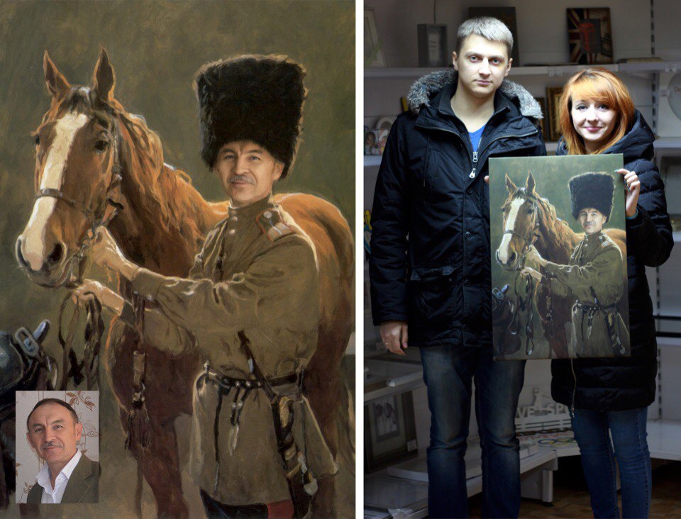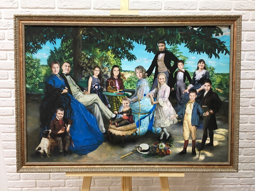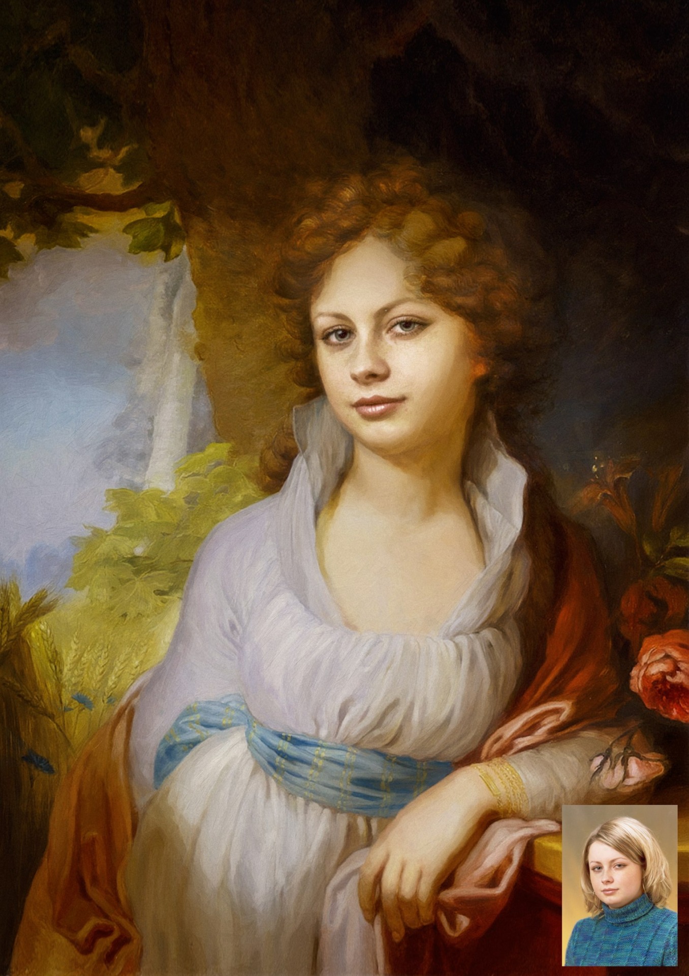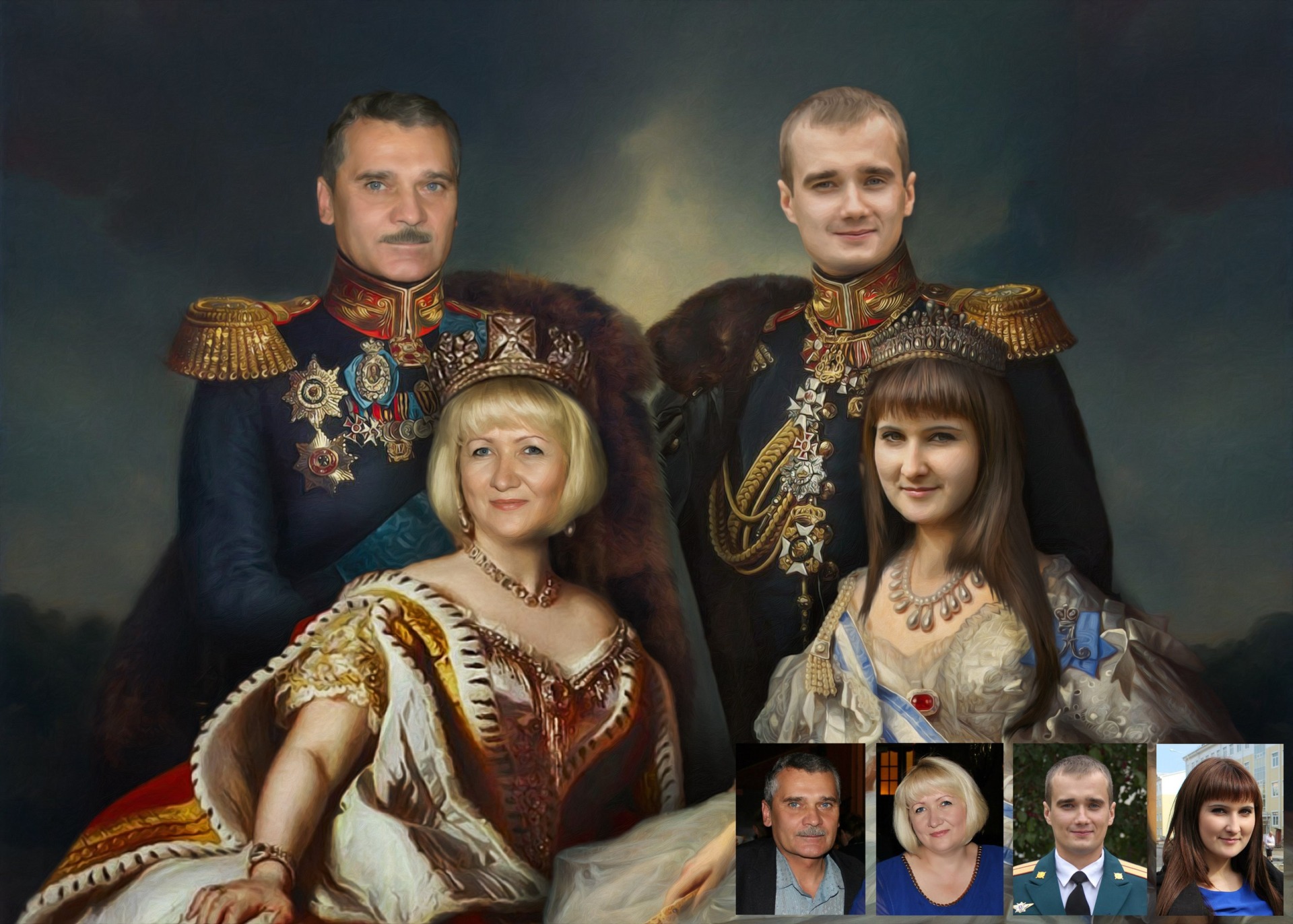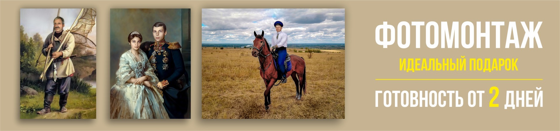 Фотомонтаж – это особый вид портрета, где в любую картину, фотографию или рисунок можно вписать лицо с вашей фотографии, после чего стилизовать всё изображение целиком. Если у вас нет варианта картины для подстановки, мы можем предварительно подготовить подборку изображений согласно вашим предпочтениям.