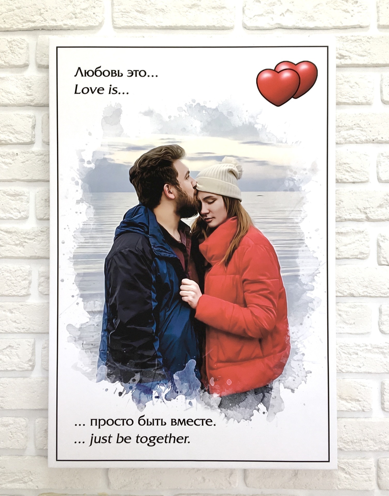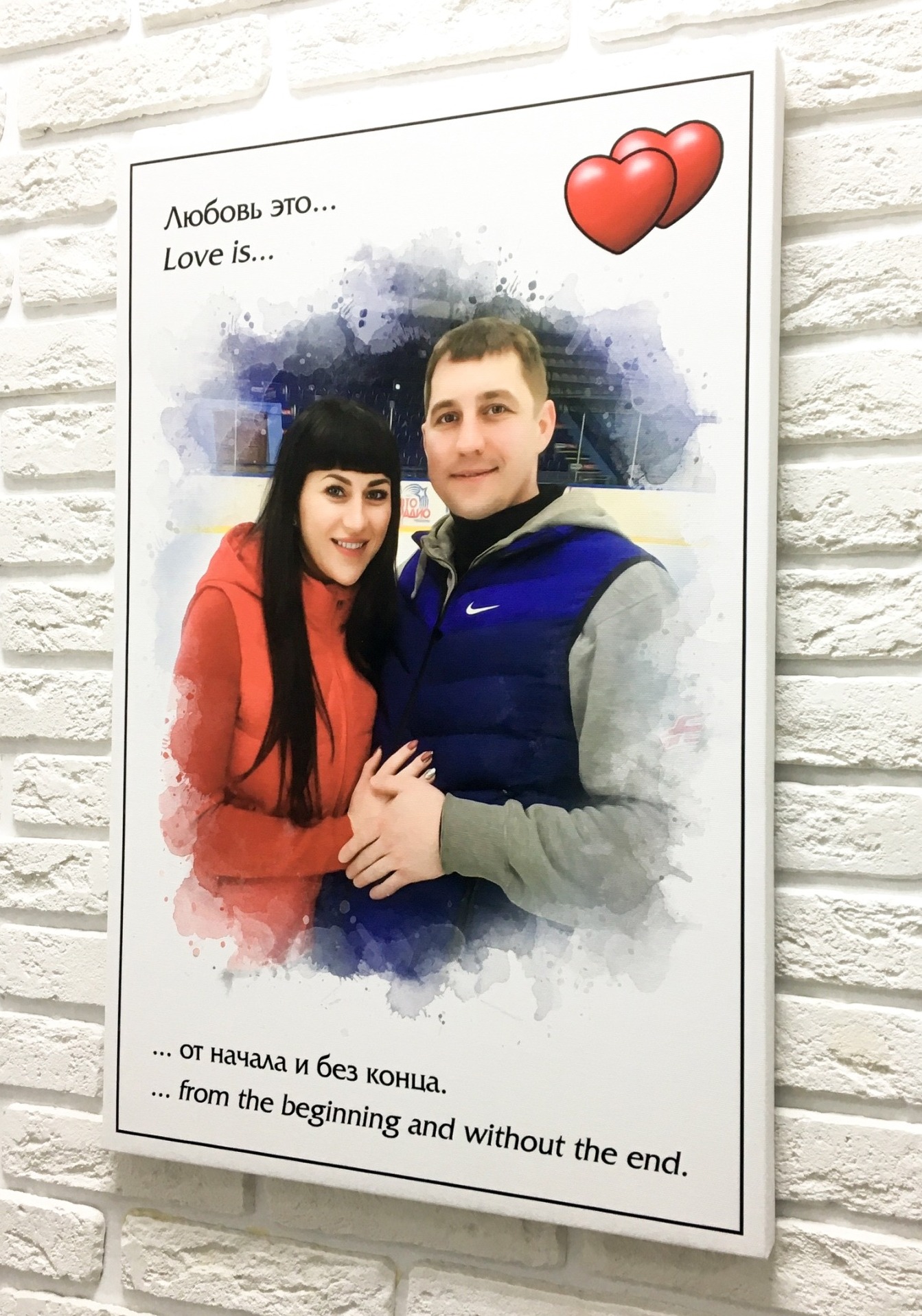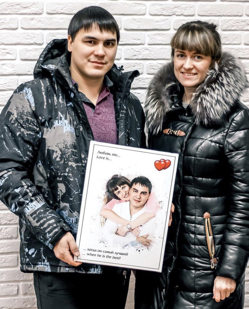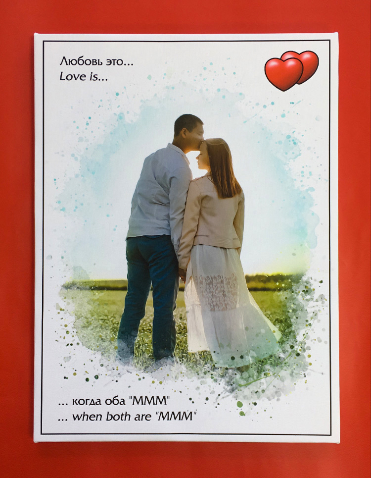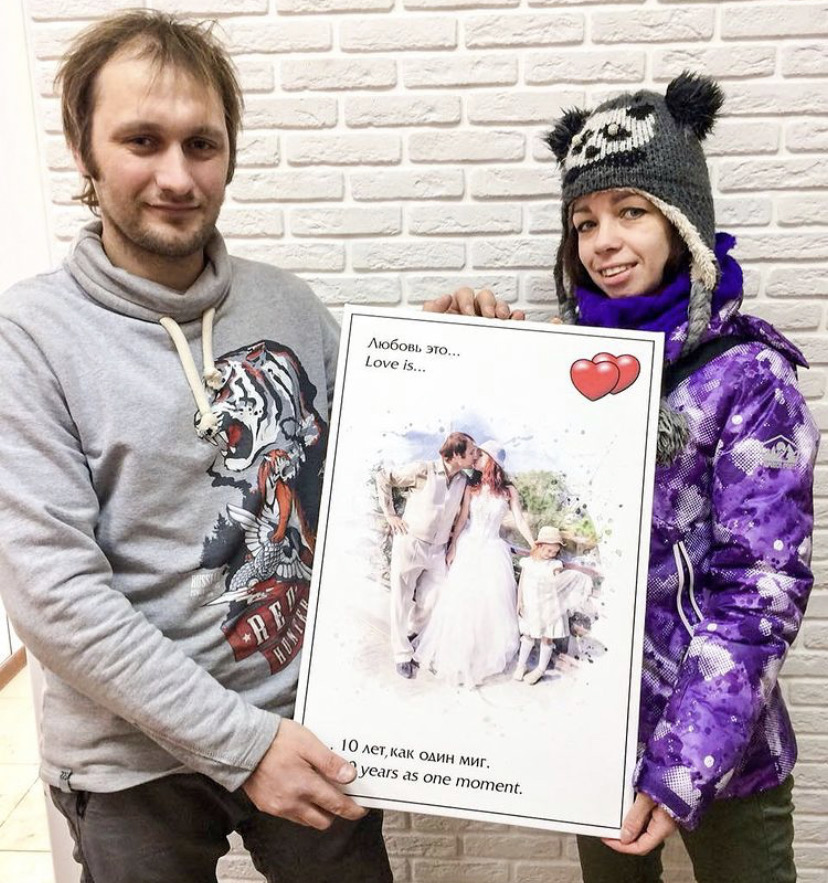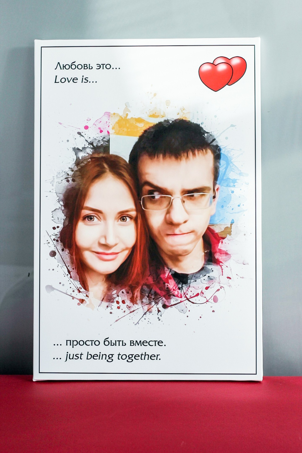Выбрав фотографию, которая является особенной для вас обоих, вы можете напомнить своей половинке о незабываемом моменте в жизни и сделать так, чтобы приятные эмоции вспыхнули вновь. Для такого подарка не нужен повод. Заказать портрет Love is по фотографии в Тюмени можно прямо сейчас! .