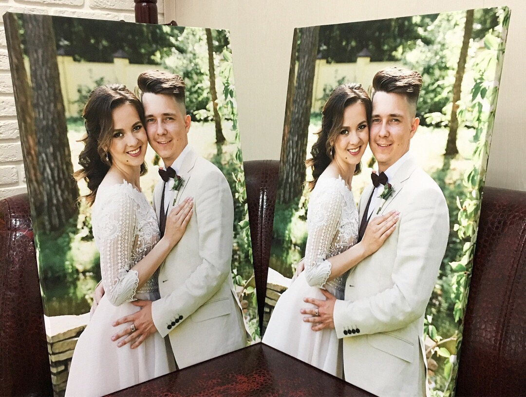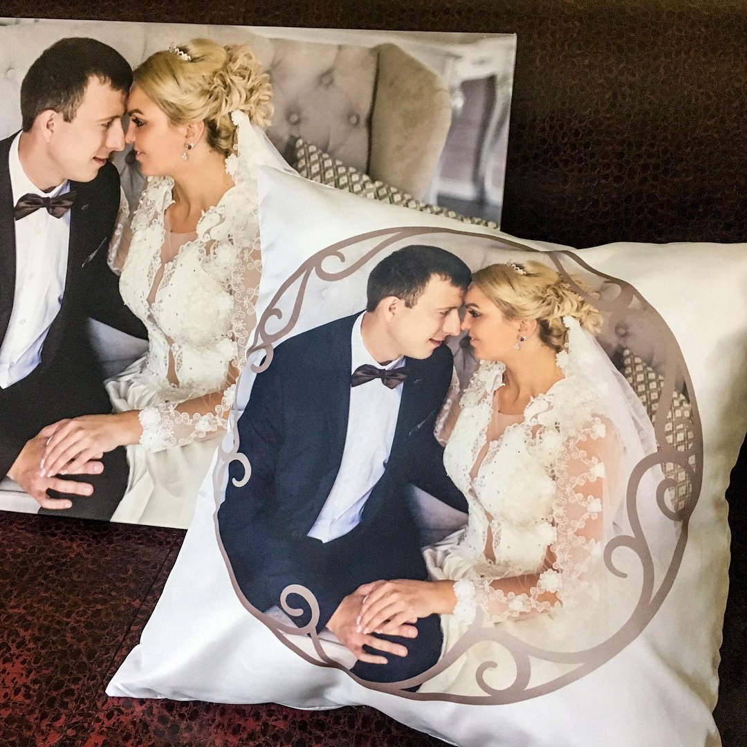 - Холсты или фотоподушки в день свадьбы в подарок родителям с доставкой на банкет;