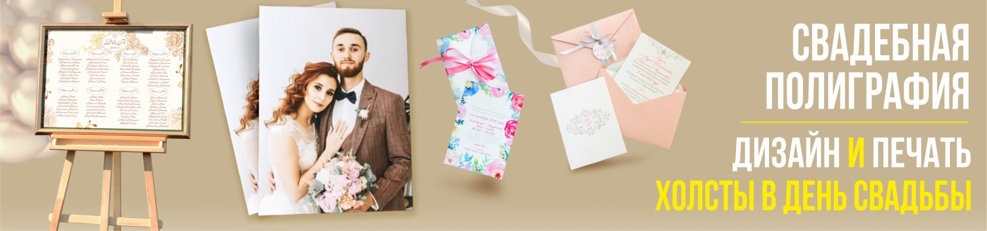 А также мы готовы создать уникальный дизайн, качественно и оперативно отпечатать всё, что нужно для вашего торжества: