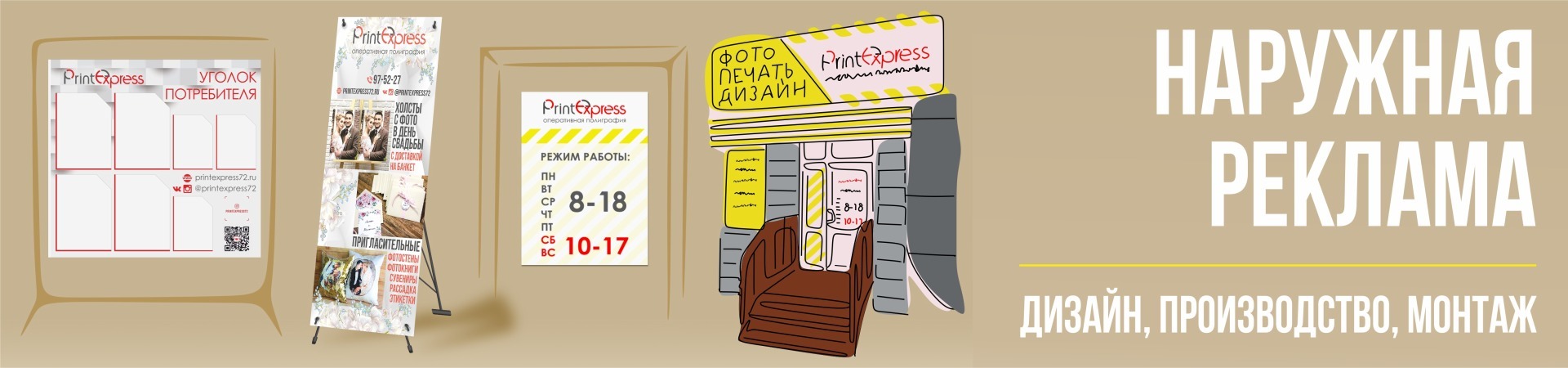 У нас Вы можете заказать дизайн и печать наружной рекламы. Мы печатаем единичные изделия, такие как баннеры, таблички, наклейки, а также предлагаем комплексное рекламное оформление магазинов, салонов, кафе, выставок. Кроме печати, мы также осуществляем дизайн наружной рекламы, замеры и монтаж.
